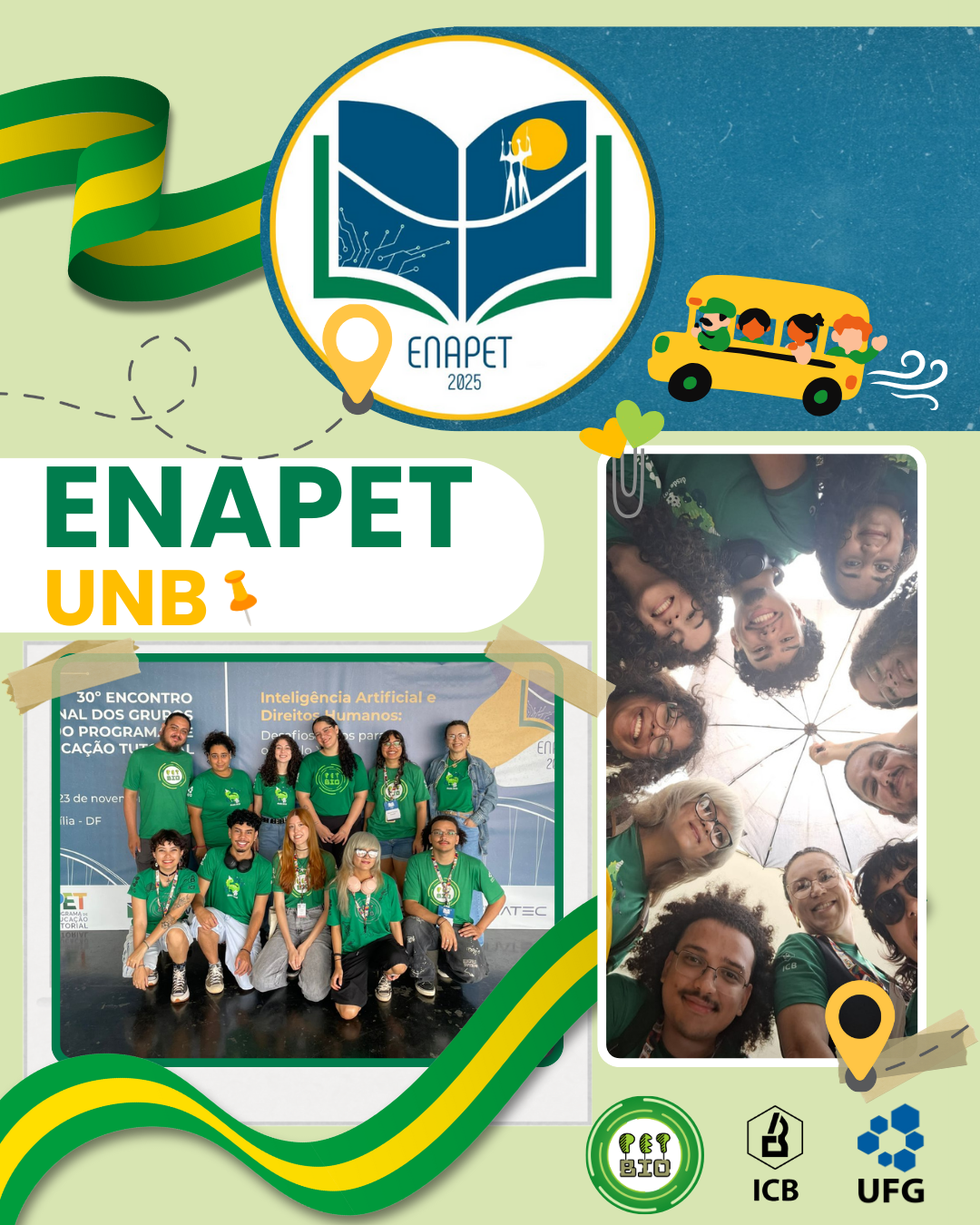 Entre os dias 21 e 23 de novembro, o PETBio marcou presença no 30º Encontro Nacional dos Grupos PET (ENAPET) @enapet2025 de 2025, que ocorreu na Universidade de Brasilia (UnB), Brasilia. Durante o evento apresentamos dois trabalhos, intitulados “PET E SOCIEDADE: O PETBio COMO ARTICULADOR DOS OBJETIVOS DE DESENVOLVIMENTO SUSTENTÁVEL” e “VISITAS TÉCNICAS COMO ESTRATÉGIA DE FORMAÇÃO EM BIOLOGIA: EXPERIÊNCIAS EM ÓRGÃOS AMBIENTAIS E PATRIMÔNIOS NATURAIS”, e ministramos uma oficina com o titulo “O CANVA COMO FERRAMENTA DE DIVULGAÇÃO CIENTÍFICA ACESSÍVEL”. O evento foi uma excelente oportunidade de integração e troca de conhecimentos com grupos PET de todo o Brasil, o que é essencial para o contínuo aperfeiçoamento do Programa de Educação Tutorial!