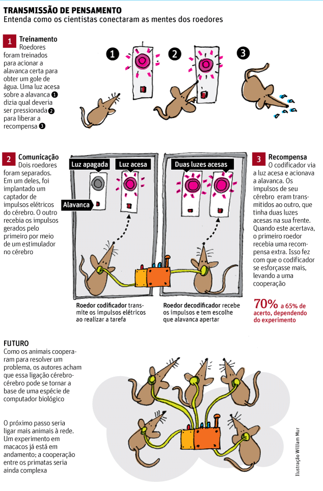 É o que anunciaram cientistas nesta quinta (28) em publicação na revista "Scientific Reports". A equipe, integrada pelo neurobiólogo brasileiro Miguel Nicolelis, afirma ter captado impulsos elétricos do córtex motor e tátil de roedores e transferido essas informações para outro animal, estabelecendo uma ligação entre os dois em tempo real.